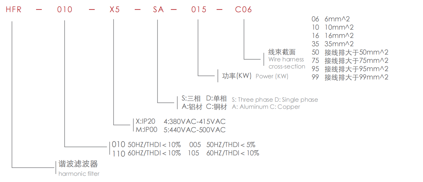 谐波滤波器(HFR)包括主电感器L1和L2和电感器L3以及电容器C组合的二级吸收电路,单元可配装互感器TA以及支路接触器KM,吸收电路需要特别调整,可改善以第5次和第5次以上的谐波电流。基波频率50HZ和基波频率60HZ的电路是不同的基波频率。滤波器性能随负载功能的变化而变化。额定负载下,HFR滤波器的性能THDi≤5%或≤10%